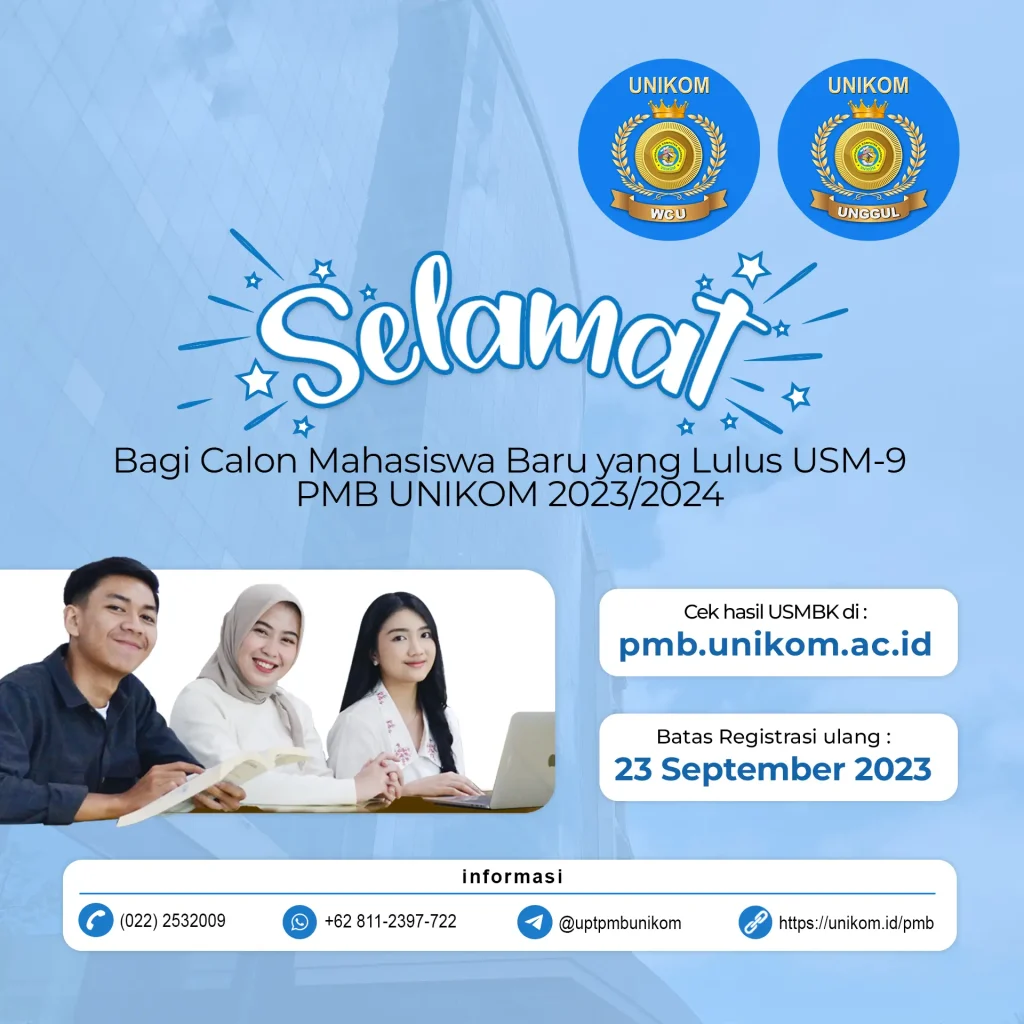 Selamat Kami ucapkan kepada para Mahasiswa Baru yang telah dinyatakan lulus Ujian Saringan Masuk (USM) PMB UNIKOM Gelombang III USM 9 yang digelar Sabtu, 16 September 2023.